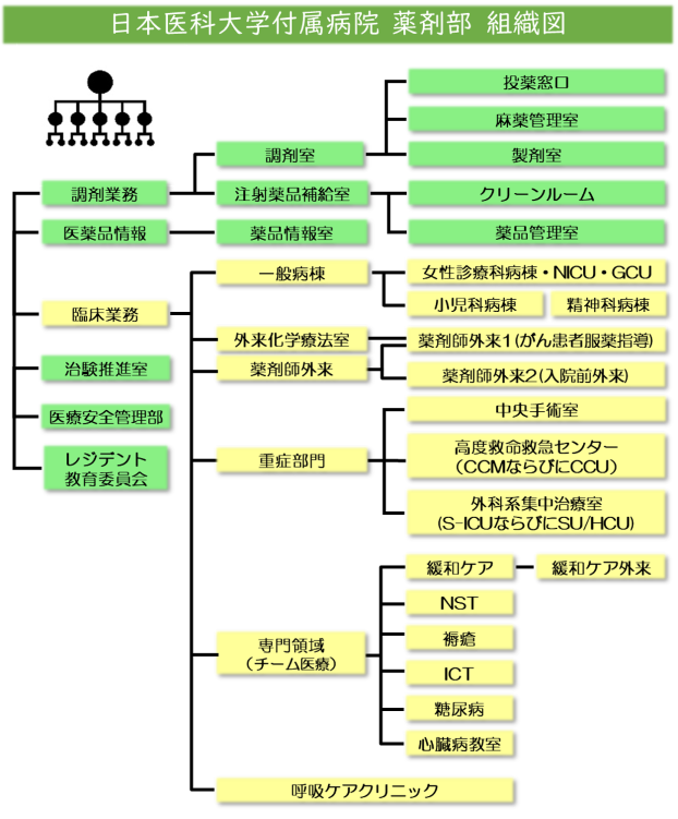 現在薬剤部では、がん医療、緩和医療、感染対策、褥瘡、糖尿病、輸液栄養管理、小児医療、救命救急、集中治療、PET(Positron Emission Tomography)、手術部に専門の知識を持った薬剤師を派遣しています。